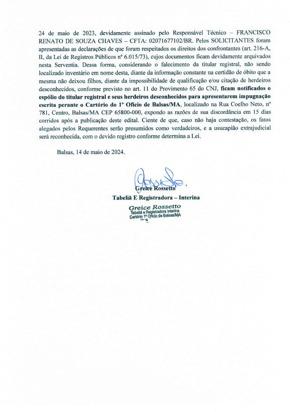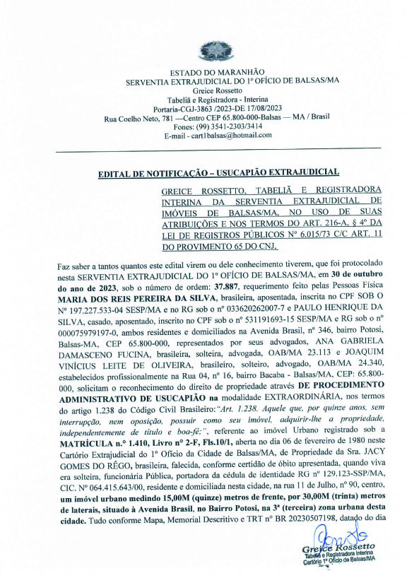 EDITIAS EDITAL DE NOTIFICAÇÃO – USUCAPIÃO EXTRAJUDICIAL Por Folha do Cerrado - 17 de julho de 2024 983 0 FacebookTwitterPinterestWhatsApp [pro_ad_display_adzone id="1326"] Notícias RelacionadasMAIS DO AUTOR EDITIAS EDITAL DE CONVOCAÇÃO ASSEMBLEIA GERAL – APEC EDITIAS Edital de Convocação EDITIAS EDITAL DE CONVOCAÇÃO ASSEMBLEIA EXTRAORDINÁRIA DEIXE UMA RESPOSTA Cancelar Resposta Please enter your comment! Please enter your name here You have entered an incorrect email address! Please enter your email address here Save my name, email, and website in this browser for the next time I comment. Favor digite a resposta em dígitos:dois + treze = + LIDAS Em live pela rede social, prefeito Erik anuncia sucessor para a... 4 de setembro de 2023 Lahesio Bonfim é oficializado candidato ao Governo do Maranhão 1 de agosto de 2022 Saiba quem são os empresários bolsonaristas investigados pela Polícia Federal 23 de agosto de 2022 TREs já receberam 91,33% das novas urnas contratadas para as Eleições... 6 de fevereiro de 2024 Leia Mais + NOTÍCIAS Balsas Instituto Agrex inicia cursos de capacitação para o 2º semestre Ensino Pé-de-Meia: nascidos em setembro e outubro recebem hoje (4) incentivo Balsas População de Balsas/MA impede aumento salarial de 40% para vereadores e... Justiça Pai que estuprou duas filhas menores é condenado a 72 anos...