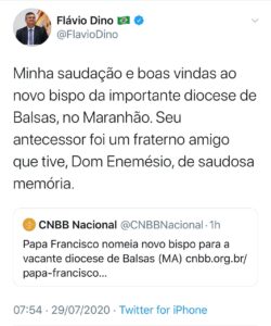 O governador Flávio Dino manifestou-se diante da boa notícia e publicou saudações em sua página da rede social. Para o governador, o antecessor, Dom Enemésio, foi um “fraterno amigo” e que ainda tem saudades.