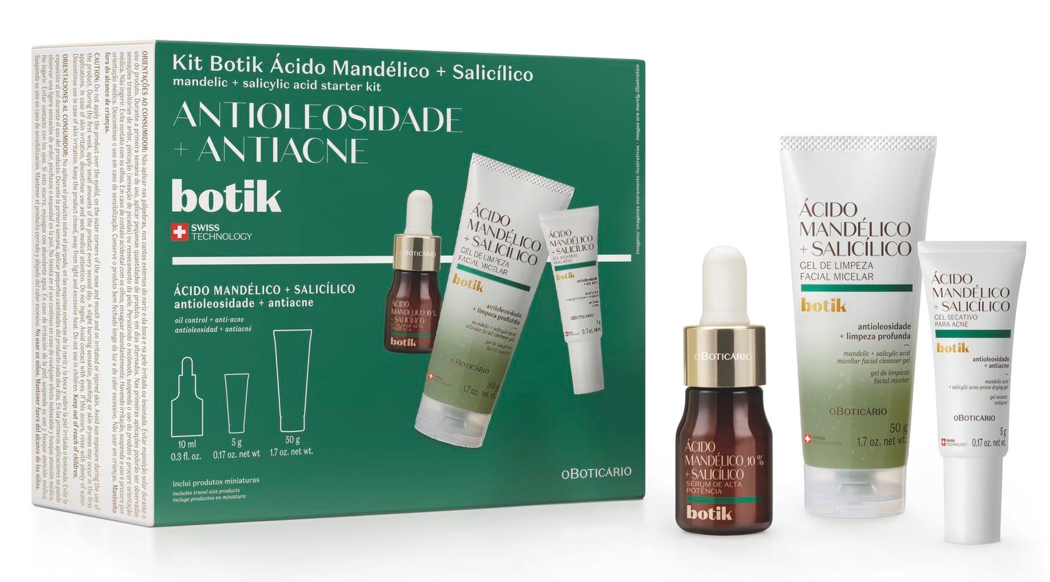 Para quem quer conhecer a linha, o Kit Experimentação Miniatura Ácido Mandélico + Ácido Salicílico reúne três itens em versões menores para que o consumidor possa experimentar e entender a adaptação da pele. São eles: o Sérum de 10 ml, Gel de Limpeza 50 g e Gel Secativo 5 g. É também uma opção para ter sempre disponível no nécessaire, tanto no dia a dia, quanto em viagens.