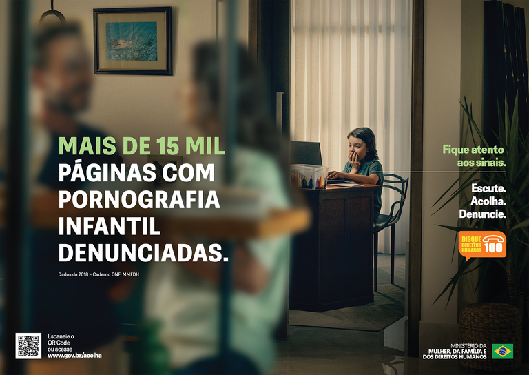 A campanha de combate aos crimes na internet contra crianças tem o mote “Fique atento aos sinais. Escute. Acolha. Denuncie”.