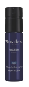 O Body Spray Desodorante Malbec Ultra Bleu garante proteção e cuidado enquanto você cuida do seu dia a dia. A fragrância amadeirada e fresca é envolvida por uma perfumação impactante, que traz notas ultrarrefrescantes do vinho francês maturado no fundo do Mar Mediterrâneo. Com o desodorante Malbec Ultra Bleu, você tem: