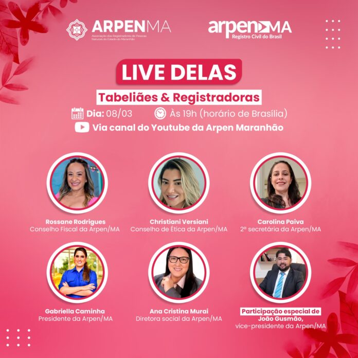 Com o objetivo de prestar homenagem ao Dia Internacional das Mulheres, a Associação dos Registradores de Pessoas Naturais do Maranhão – ArpenMA realizará nesta quarta-feira (08/03) a “Live Delas: Tabeliães & Registradoras”. O encontro online terá início às 19h, no horário de Brasília, e será transmitido por meio do canal da entidade no YouTube.