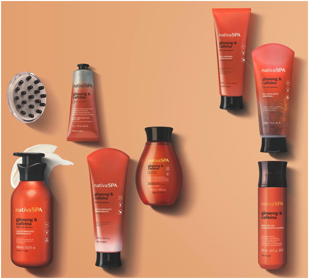 Loção Drenante Desodorante Corporal Nativa SPA Ginseng& Cafeína  Preço sugerido (400ml): R$ 67,90  Preço sugerido (200ml): R$ 46,90  A Loção Drenante Desodorante Corporal, aliada à automassagem, auxilia no efeito drenante, com efeitos visíveis, em até três semanas de uso. O óleo nutritivo de quinoa, que é um segredo exclusivo da marca, complementa a dupla de ginseng e cafeína e aumenta a produção de colágeno, reconhecido por trazer firmeza para a pele.   Gel Anticelulite Corporal Nativa SPA Ginseng & Cafeína 200ml  Preço sugerido: R$ 109,90 Com 3% de cafeína, sua fórmula é termo ativada durante a massagem e ajuda a reduzir os aspectos da celulite do glúteo em até 14 dias*. Com a ajuda do ginseng, da cafeína e do óleo nutritivo de quinoa, reduz o inchaço, tonifica a pele e auxilia na melhora da produção de colágeno. *Período de teste realizado na região dos glúteos.   Gel Esfoliante Corporal Nativa SPA Ginseng & Cafeína200g   Preço sugerido: R$ 64,90 Com partículas esfoliantes de café e textura em gel, esse produto promove a esfoliação da pele, removendo células mortas e preparando-a para receber os ativos da linha.   Óleo Desodorante Hidratante Corporal Nativa SPA Ginseng & Cafeína 200ml  Preço sugerido: R$ 67,90 Abundante em sua fragrância penetrante, apaixonante e envolvente, esse produto garante hidratação profunda e, com a ajuda do ginseng e da cafeína, proporciona sensação de pele tonificada e firme.   Creme Hidratante de Mãos e Pés Nativa SPA Ginseng & Cafeína 75g  Preço sugerido: R$ 43,90 Além de hidratar e ajudar na diminuição do inchaço, o creme voltado à região dos pés e das mãos também agrega sensação refrescante, que ajuda na percepção de melhora do cansaço nos membros.     Body Splash Desodorante Colônia Nativa SPA Ginseng & Cafeína200ml Preço sugerido: R$ 67,90 O Body Splash de Ginseng & Cafeína tem cheiro marcante e envolvente, com notas doces e especiadas inéditas na cadeia olfativa do Boticário. É o elemento perfeito para complementar o momento de autocuidado, promovendo a fixação intensa e única da fragrância.